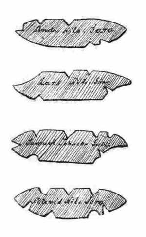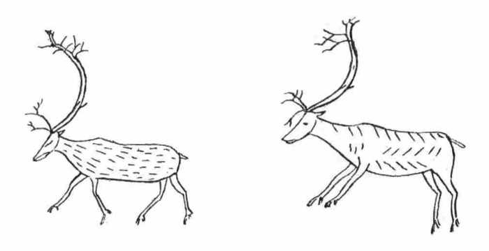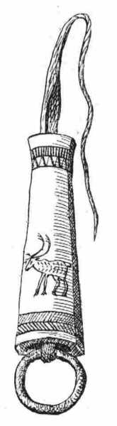 Ezeken a késtokokon akadunk azután a tarándszarvas alakjára is (60. kép), mely késheggyel van bevésve, még pedig nagy biztossággal és úgy, hogy abban a rajzban minden kezdetlegessége mellett is az állatot jellemzők mind benne vannak. Van álló és mozgó alak, apróbb és nagyobb; sőt szereztem olyan kést is, melynek tokján nem kevesebb mint nyolcz szarvas alakja van kivésve; készítője Anders Henduruk Son András Henrik fia, ugyanaz, a ki a Tromsdal-tanya képén guggol és rőzsét vág a fejszéjével.