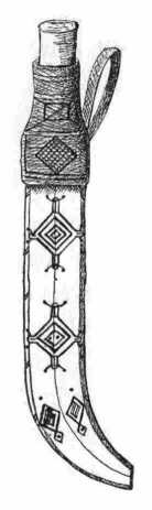 A legszebb díszítésű az a kés, a melyet Hammerfestben szereztem egy lapptól s a melynek rajzát az 59. képen adom is. A díszítés, bár egyszerű, de stilszerű; illik a tárgyhoz és az anyaghoz egyiránt. A technika a képzelhető legegyszerűbb: bevésés s a vésettnek korommal és zsírral való kitöltése, tehát szakasztott az az eljárás, a melyet ungmegyei kanászaink ivókürtjeiken használnak.