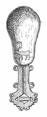 egészen sajátságos kanalakon látható. Ezek szintén tarándszarvas szarvából valók. A kanálrész a végén nem hegyesedik ki, hanem éppen ott a legszélesebb. Nem éppen mély; a nyél rövid, mindössze 5.5 cm.; az egész kanál 11.5 cm.; a kanálrész legnagyobb szélessége 4 cm. A mint a 61. képen látható, az áttörés a karika és a háromszög kombinácziójából telik ki.