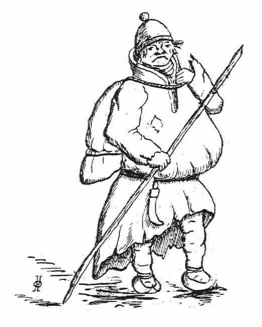 És a midőn Tromsdal lapp telepe táján búcsúpoharat ürítettünk, az utolsó üdvözlet, a mellyel a megszeretett völgy kedveskedett, egy lapp csavargó (64. kép) volt, ki sátorról sátorra járva, tengette életét. Bő kámzsájáról rég lekopott az utolsó szőrszál, alja merő czafat, rongy; czókmókjának fele a hátán lógó zsákba, a másik fele a kámzsa elejébe tömve, mely az amúgy is formátlan alakot békaszerűen puffasztotta föl; kezében hosszú nyírfahusáng: az "omnia mea mecum porto" [mindenemet magammal hordom] igazi élő képe.
