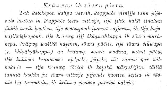 (v. khloäkχākappā)ān kräuwą. söura wuäinā, satnă pāčā, tlje kuhkete kräuwose: "jĕlpele, jĕlpele, tū°. rauwă par wĭlkoka!" tlje kräuwą čöččtă ih kaļakā wärjašĕjitn. tälliä tänniä kaskšn jū söura vittnije pijevuls kuotien sĕjisa ih täšnie leä tammtālā, ih kräuwą poačas purriei nälnie.