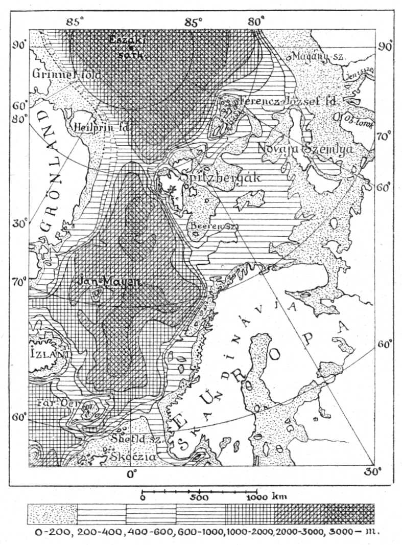 éspedig annál sűrűbben, minél mélyebb a tenger. A jelmagyarázat számai a tenger mélységeit jelentik méterekben.