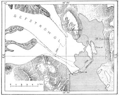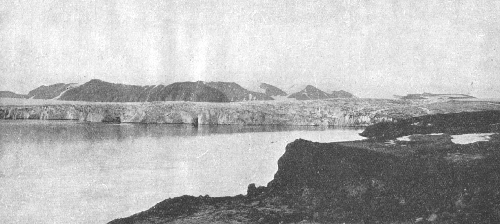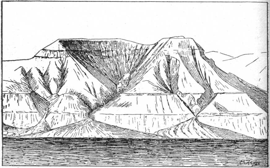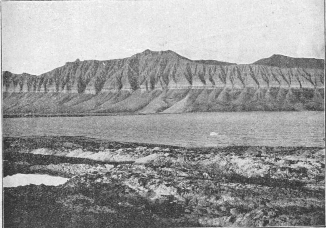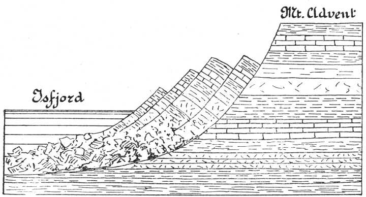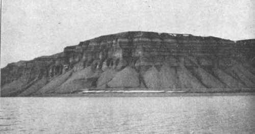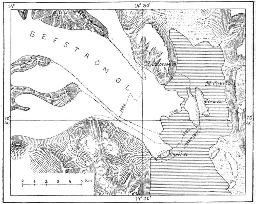 53. képünkön lehet látni ilyen fölemelt tengeri szinlőket, a Tempel-szöglet délkeleti oldaláról. Valamikor a tenger 5060 méterrel magasabban állt, mint ma, a szigethez képest. Ugyanezt a tüneményt egész Norvégiában és Svédországban nyomon lehet követni. A Spitzbergákon sokkal kevesebb nyom maradt meg, mert a jég terhétől felszabadult szigetcsoport rögtön kiemelkedett, amint a jég eltűnt. Norvégiában ez nem volt lehetséges, mert Skandinávia a tengerből csak igen fokozatosan emelkedett ki, a jég visszahúzódása közben.