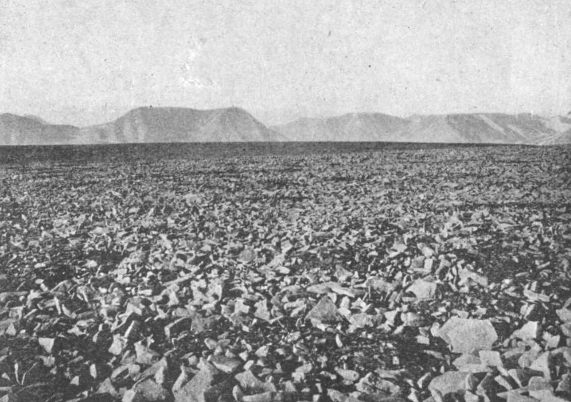 Az Advent-öböl mélyén kis, lankásoldalú völgy vezet föl a platóra. Ezen mentünk föl mi is. A völgy tele van hányva szögletes kövekkel. Furcsa látvány! A völgy fenekén semmi nyoma a pataknak, vagy vízmosásnak. A feneket éppen olyan laza, durva kőtenger fedi, mint a völgyoldalakat. Ez a kőtenger egyik oldalon a plató magasabb részeiről lejövő, kezdetleges gleccser morénájába megy át, a másik oldalon az előbb leírt hammadába.