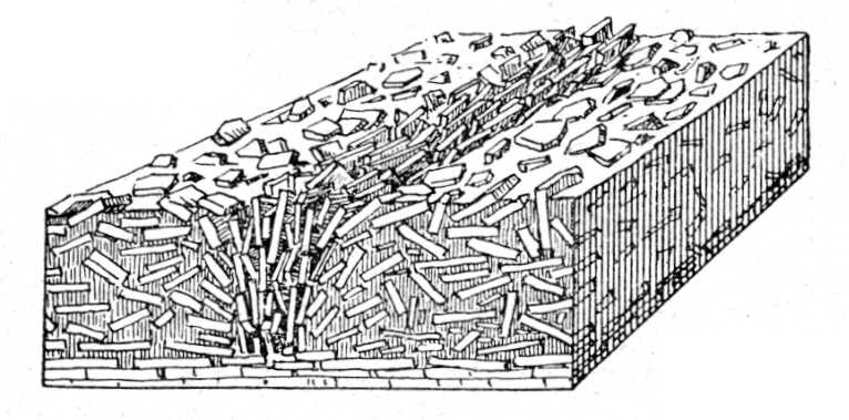 képpen összeforgatva, egymáshoz tömve hevernek a felszínen (66. kép). Ha elhányjuk őket, észrevesszük, hogy lefelé mind kevesebb és kevesebb a rendetlenség közöttük, mind több és több homok és agyag tölti meg a lefelé kisebbedő hézagokat, s mintegy félméternyi mélységben összerepedezve ugyan, de eredeti helyükben találjuk meg már a rétegeket.