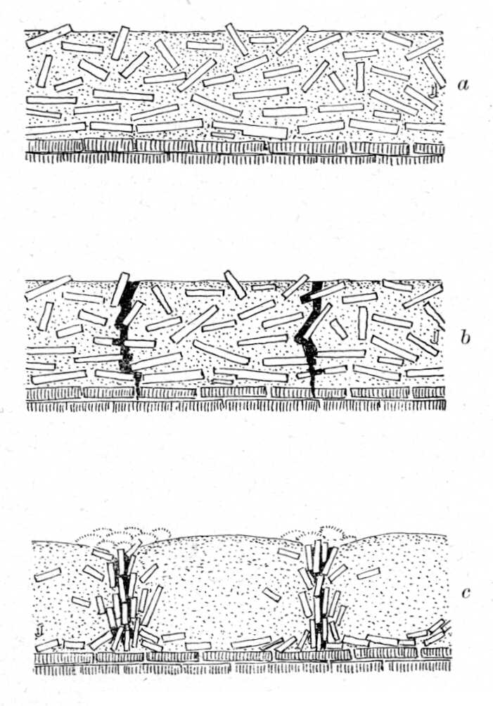 71.kép. A poligonális tundra keletkezésének magyarázata. a Kifagyás folytán keletkezett, reziduális kőzettörmelék. b A megrepedezett kőzettörmelék. c A poligonális tundra vázlatos metszete.