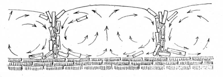 kövek közül megint belehullik egy. A játék ismétlődik. A törmelék részecskéi igen lassú, de állandó körmozgásban vannak. Fenn a sokszögű tundradarab felső részén a kövek kifelé mozognak, a repedések felé, lenn, a törmelék alsó rétegén befelé mozognak, a hasáb közepe felé, de a kövek a fenékről fölemelkedni nem tudnak. Csak a finomabb, képlékenyebb anyag mozdul fölfelé. Ezt a mozgást a 72. ábra rajza mutatja. A nyilak mutatják, hogy az egyes kövek, részecskék, homok- és agyagszemek milyen irányban mozdulnak el. Ez a mozdulat egy évben csak néhány tizedrész milliméter lehet, de évezredek alatt ez azt eredményezi, hogy a nagy kövek mind a hasadékba kerülnek, az agyag és homok pedig összetorlódik a tundra-hasáb közepén. A nagy köveken a mohapárnák megmaradhatnak, mert gyökereiket olyan részek közé nyújtják le, amelyek inkább süllyedőben vannak. A tundra-sokszög közepén a moha nem maradhat meg, mert a törmelék mozgása gyökerüket kitolja.