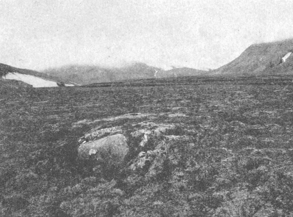 A falak lába előtt ott van a keskeny partszegélyen a tundra. Szomorú, sötét-szürkészöld színéből csak itt ott csillanik ki a vizenyősebb helyek üde zöldje. Amott a lankás lejtőn látjuk a rejtelmes, lefeküdt tundra téglahasábjait, mint valami óriás-szántás szabályos hantjait. A mozgó, mászó tundra rányomult az egyik nagy vándorkőre. (73. ábra.) Ez az óriási, messziről jött, környezetében egészen