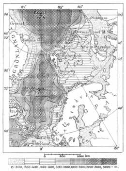 A Spitzbergák, Norvégia és Szibéria északi partjai közt aránylag sekély tenger terül el. Nagy darabokon ez a tenger nem mélyebb 200 méternél, de sehol sem mélyebb 400 méternél.