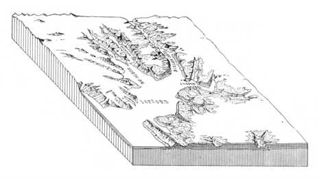 52. ábra. A Nyugati-Spitzbergák középső részének, a Jég-fjord környékének tömbszelvénye. Vízszintes méretek: 1:1.200.000, magasságok: 1:300.000, a torzítás tehát négyszeres. A szelvény hossza és szélessége 120120 km. A fehér foltok hóval és jéggel fedett, nem térképezett részletek.