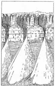A hó olvadó vize a kövek között, a törmelékben szivárog alább. Mélyről jövő források a föld fagya miatt nem lehetségesek, de az óriási törmelékgarmadák kövei közül a garmadák lábánál sok víz szivárog elő, s ilyen helyeken süppedős, iszapos helyek vannak, tele nyerszölden virító tundrával. A tundra színe elárulja már a fakadékot. A víz azután a tundra kövei közt határozott utat vesz, ennek az útnak mentén a törmelék finomabb, agyagosabb részét elhordja. Emiatt itt a kövek besüllyednek. Csakhogy a tundra a fagyás és megolvadás következtében mozog, és a mélyedést erős oldalnyomással ismét megszüntetni törekszik. A vízfolyástól jobbra és balra fekvő, agyaggal tömített törmelékréteg lassanként összetolódik, összenyomja a vízfolyásban tisztára mosott, lazán fekvő köveket. De aztán túl hajlik föléjük s a törmelék beleomlik a vízfolyás sekély mélyedésébe. Az így odakerült iszapot megint elhordja a víz, csak a kövek maradnak ott, szépen élükre állítva. A hammadában valóban a vízfolyásokat élükön álló, nagy kövek jelölik a törmelék többi, zűrzavaros részével szemben (69. ábra).