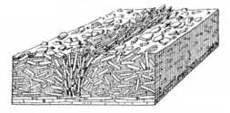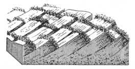 A 67. ábrán látunk olyán tundrát, amely tégla alakú hasábokra bomlott szét, a hasábok alsó része előre csúszott, s a hasábok szépen lefeküdtek. A 68. ábra mutatja mostani helyzetüket. Nagyon gyakori jelenség ez lankás lejtőkön, de igen különös látvány. Mintha óriási gőzeke szántotta volna föl a tundrát, de olyan csodálatos eke, amelyik igen szabályos, téglaalakú hantokat metsz ki.