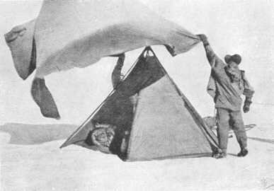 EVANS óriási munkabírású, figyelemreméltóan értelmes útitárs. Most látom át csak teljes mértékben, mennyit, de mennyit köszönhetünk neki. Szeges sícipőink teljességgel nélkülözhetetleneknek bizonyultak; ha a föltalálás eredeti ötlete nem tisztán tőle származik is, a cipők mesteri elkészítése az ő érdeme. Ő a felelős a szánokért és minden fölszerelésért: sátrakért, hálózsákokért, szerszámokért, és még soha semmi panasz el nem hangzott, hogy valami ne volna tökéletes rendben. Ő ügyel föl a sátor felállítására és a szán gondos terhelésére.