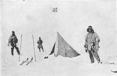 [Elöl: Bowers, Wilson. Hátul: Oates, Scott, Edgar Evans.]Nem egészen egy kilométernyire innen dél felé találtunk egy hóba tűzött régi szántalpat. Viaszosvászon lengett rajta lobogó gyanánt. Azt hiszem, ezzel jelölték meg a norvégek a Sark pontos helyzetét, amennyire ezt meghatározniok sikerült. A hely tengerszín feletti magassága 2900 méter. A rája erősített kis följegyzés szerint sátruk a Sarktól kb. 3,7 km-re van. WILSON eltette a följegyzést.