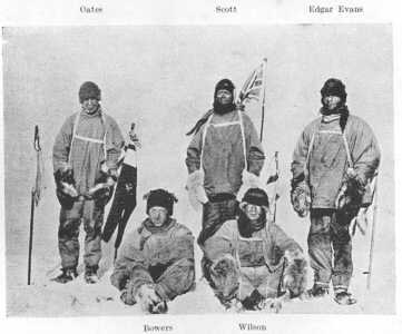 A Déli-sark elérése.1912. Januárius 4., csütörtök. 57. tanya. Tengerszínfeletti magasság 3130 méter. Búcsút véve az utolsó segítőcsapat tagjaitól, ötödmagammal maradtam: WILSON, OATES, BOWERS és EVANS (altiszt) társaságában. Egyetlen szánnal folytattuk előnyomulásunkat. Estig még 11 1/2, összesen a mai napon 23 kilométernél többet tettünk meg változó térszínen. Délután laza porszerű hóra jutottunk, és a szán vontatása kínos feladat volt. A szél elült, és most este a levegő teljesen nyugodt. A Nap olyan enyhén tűz, hogy a 26 fokos hőmérséklet mellett is egészen kellemes a kinntartózkodás.