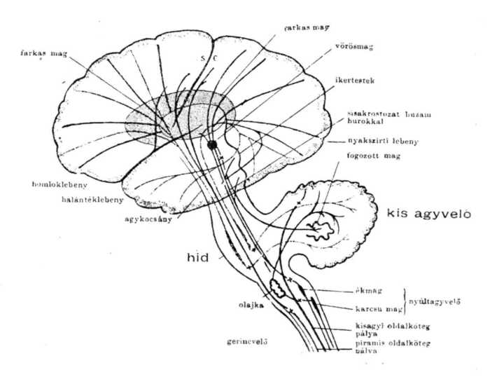 Hogy az agyműködések iránt annyira, a mennyire tárgyunk megértésére szükség, tájékozódhassunk, e végből az agyon több részt különböztetünk meg, melyek a 4. ábrán fel vannak tüntetve. Alul az ábrán a gerinczvelő látható, rajta meg van jelölve a kisagy oldalköteg-pályája, valamint a mozgató impulzusokat vezető, úgynevezett piramis pálya. A gerinczagy közvetetlen folytatása a nyúltvelő. A nyúltagyvelőn és az ábra többi részein magnak nevezett részek szürkeállományú góczok, melyekben idegsejtek vannak. Ilyen góczok nagyobb számmal fordúlnak elő a nyúltvelőben. Az agy felé a nyúltvelő egyfelől a hídba, másfelől a kis agyvelőbe folytatódik.