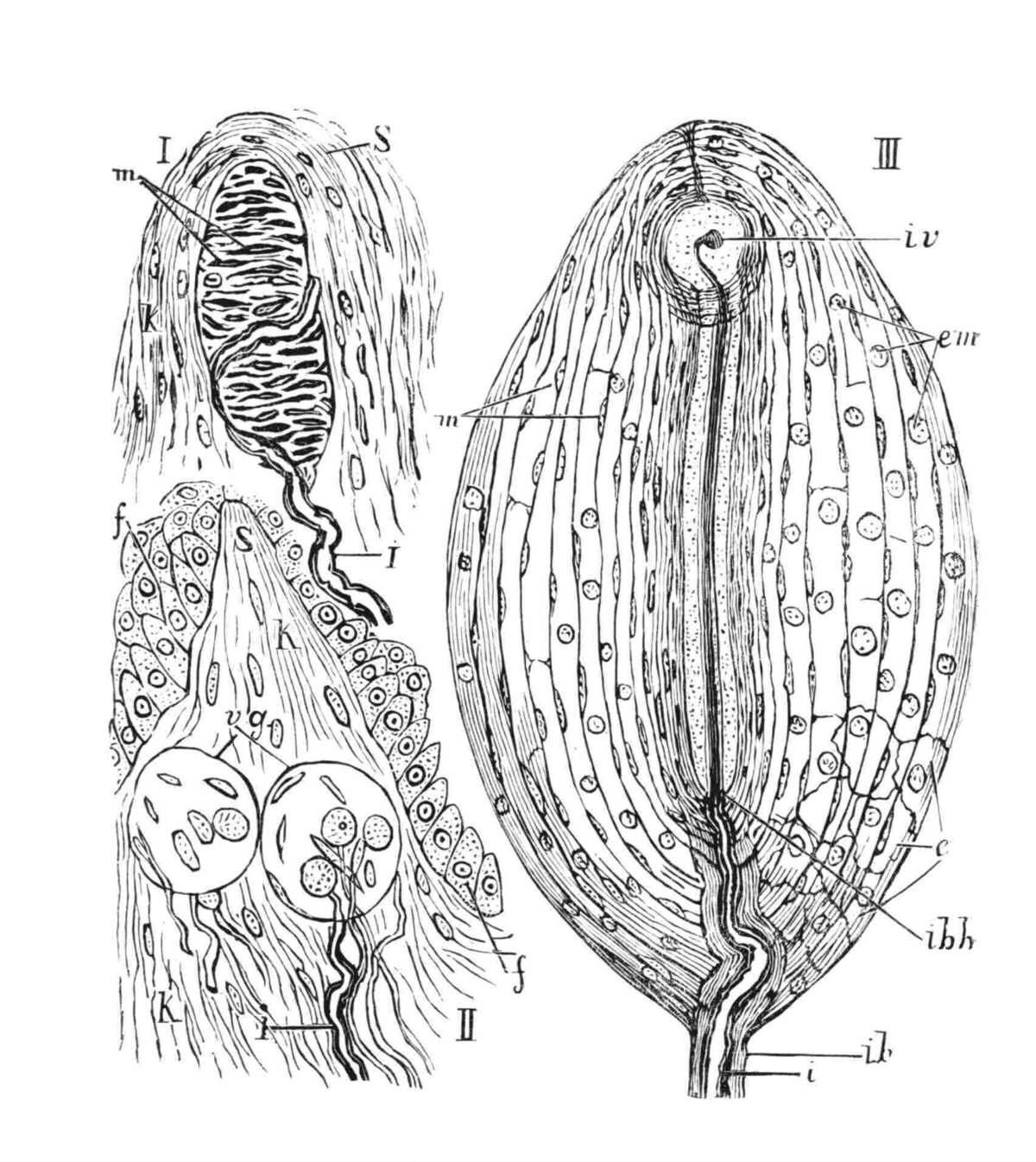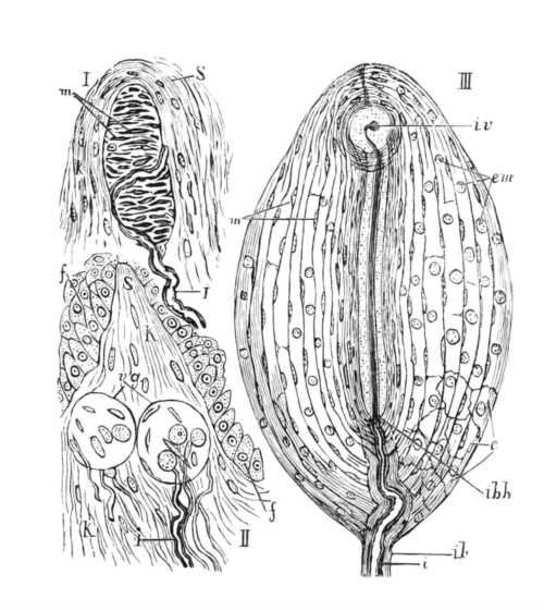 9. ábra. Tapintó végkészülékek; I. MEISSNER-féle tapintó végkészülék, ember ujjából; II. KRAUSE-féle véggömb, ugyanonnan; III. VATER-PACINI-féle tapintótestecske macska bélfodrából (THANHOFFER szerint).