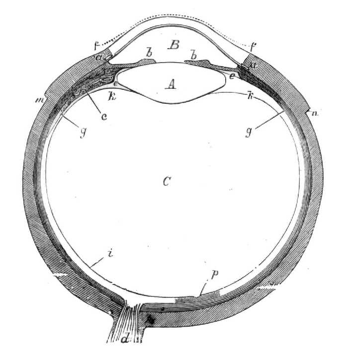 37. ábra. A szem keresztmetszete. m n ínhártya, f f porczhártya, a a Schlemm-féle csatorna, g érhártya, c sugártest, b b szivárvány-hártya, d látóideg, p sárga folt, e e Zinn-féle övecske, B szemcsarnok, A szemlencse, C üvegtest (HELMHOLTZ szerint).