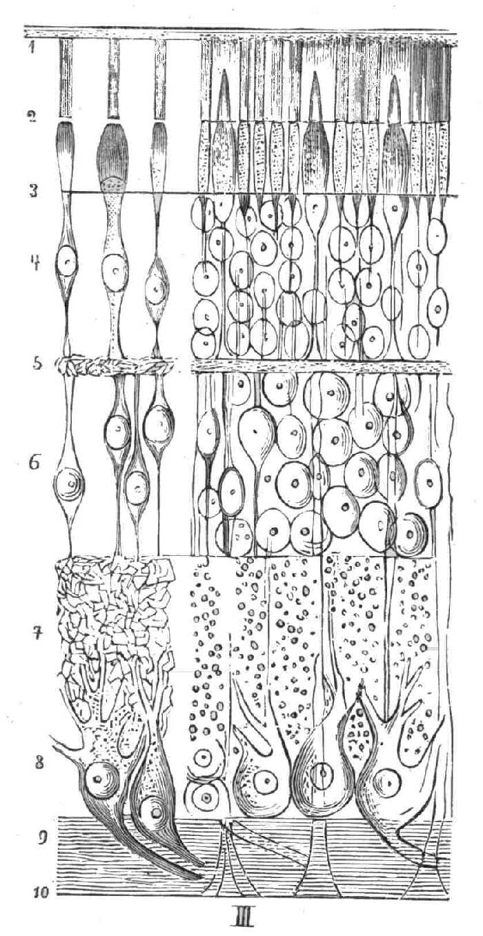 38. ábra. Ember ideghártyája, jobb oldalt átmetszetben, bal oldalt pedig az egyes alkotó idegelemek elkülönítve.