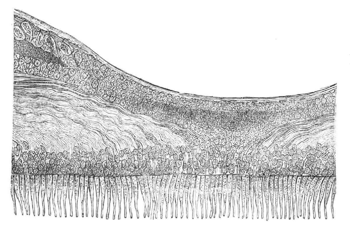 attól teljes átlátszóságával. A szem keresztmetszetén úgy tetszik, mintha a fehér inhártya oly módon fogná körül a porczhártyát, mint az óra rámája az óraüveget, azaz a porczhártya belső oldala szélesebb a külsőnél. A porczhártyán több réteget lehet megkülönböztetni. Kívül és belül hámsejtek fedik, ezek alatt következik [egy] alkatnélküli rugalmas réteg, mely a porczhártya többi állományát bezárja. Mind e részek üvegszerűen átlátszók. E miatt erek sincsenek a porczhártyában, vér nem járja át; e helyett állományát csatorna (a a), a SCHLEMM-féle csatorna veszi körül, mely tele van a vérből származó színtelen, víztiszta, tápláló nedvvel, a nyiroknedvvel. E nedv járja át a porczhártyát a benne levő finom csövekben és csatornácskákban s így táplálja azt. A hártya felette nagy átlátszósága már elárulja feladatát: rajta átjut a fény a szem belsejébe.