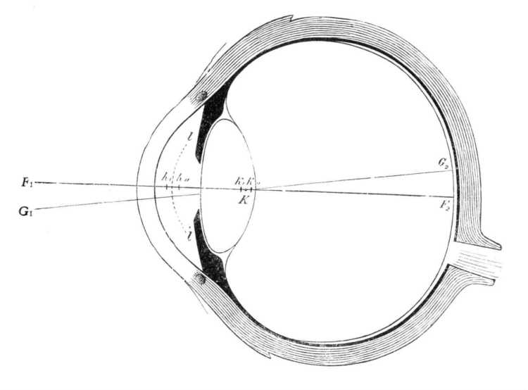 42. ábra. A jobb szem vízszintes átmetszete. F1 F2 optikai tengely, G1 G2 látóvonal (HELMHOLTZ szerint).