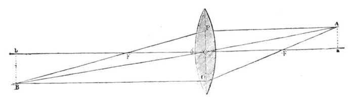 nevezzük, úgy a B O A és ehhez hasonlóan O-ra irányítva a lencsére eső vonalakat melléktengelyeknek és az irányukban beeső sugarakat iránysugaraknak mondjuk. A B-től kiinduló sugarak e szerint törés után B O A sugár irányában találkoznak valahol; egy második, ugyancsak B-től kiinduló sugár, az optikai tengelylyel párhuzamosan esik a lencsére, ez a B Q A sugár. Ez utóbbi sugár törés után, mivel az optikai tengelylyel párhuzamosan haladó sugarak törés után a főgyújtó pontban találkoznak a tengelylyel, F ponton fog keresztülmenni és ha irányát meghosszabbítjuk, A-ban egyesül a többi, B-ből induló sugárral, tehát B O A, valamint B F P A sugárral is; A tehát B-nek képpontja. Hasonlóan lehet b-nek képpontját is b-ban megtalálni, valamint a B b vonal bármely pontjának képét. A a tehát képe B b-nek. A lencse előtt levő tárgynak tehát a lencsén túl fordított a képe. A kép egyszersmind annál nagyobb, mennél közelebb van a tárgy a lencse főgyújtó pontjához, F-hez és annál kisebb, mennél távolabb van attól; midőn pedig a tárgy a végtelenben van, képe egyetlen pontra szorúl össze, s ez a főgyújtó pont.