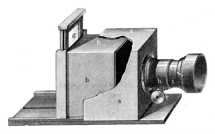 Itt is fordított a tárgy képe. Hogy a különböző távolságban álló tárgyak éles képét nyerhessük a homályos üveglapon, a végből a szekrény két egymásba tolható részből áll (a b), a lencse pedig a sárgaréz-csövön alkalmazott finom csavar (r) segedelmével előre és vissza mozgatható. E szerint úgy a képet felfogó ernyőt, valamint a lencsét is közelíthetjük a tárgyhoz vagy távolíthatjuk el tőle, úgy, a mint a tárgy távolsága megkivánja.