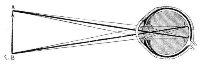 Tekintve az emberi szem említett alakját s azt, hogy tisztán csakis olyan tárgyat látunk, melynek az ideghártyagödörben éles képe van, következik, hogy a rendesen látó szem csak a végtelen távolságban levő tárgyakat láthatja jól; az ideghártya az ennél a szemhez közelebb álló tárgyaknak csak szóródásos képeit fogja fel, mert ezek éles képei valahol a szem mögött, a közelség szerint különböző távolságban képződhetnének csak. A minő arányban a tárgy a szemhez közeledik, abban az arányban távozik el képe az ideghártyától; a szóródásos kép is annál nagyobb. Hozzájárúl még, hogy valamely világító tárgy minden egyes pontjából számos sugár megy a szembe s ezek mind külön-külön szóródásos képet adnak, melyek részben ugyanazon ideghártya-részekre esnek: ilyen körülmények között az éles látás teljes lehetetlen. A szemen