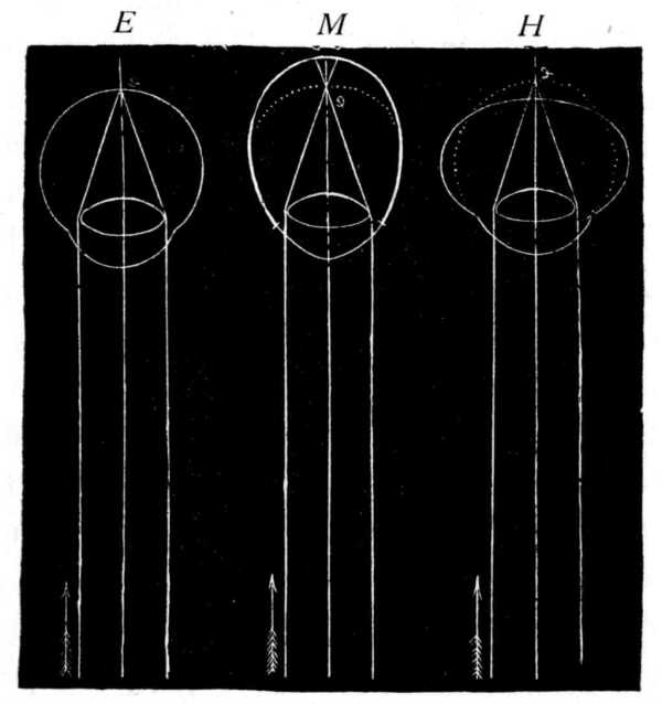 47. ábra. A szem három alakja. E rendesen látó, M rövidlátó, H túllátó szem, a szembe eső párhuzamos sugarakkal és a szemben levő gyújtópontjukkal.