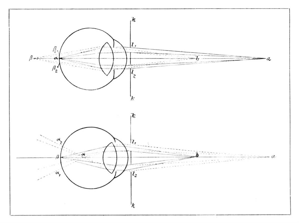 Szemünk előtt kártyalapot tartunk, melyen a szem pupillájának átmérőjénél nem nagyobb távolságban egymástól két lik van. A 48. és 49. ábrán k k jelez egy-egy ilyen kártyalapot, az l1 és l2 a megfelelő likakat. A kártyalap likain keresztül nézünk a szem előtt bizonyos távolságban tartott két tárgyat (b a), pl. két tűt. Tegyük fel, hogy szemünk az a tűt rögzíti, erre van alkalmazva. Ilyenkor az a tűtől l1 l2 likakon át menő sugarak az ideghártyán α-ban mind egy képpontá egyesűlnek. Az ugyanez alatt b-ben tartott tűtől kiinduló és a rajzon szakadozott vonallal megjelölt sugarak, mert b tű a szemhez közelebb van, csak az ideghártyán túl egyesülnének, pl. β-ban, ennélfogva mi az ideghártyán b tűnek szóródásos képeit kapjuk. A b tűtől a két likon átment sugarak még nem egyesűlhettek, a két liknak megfelelőleg azért két szóródásos kép jön létre az ideghártyán: az l1 likon átment sugarak β1-ben, az l2-őn átmentek β2-ben találják az ideghártyát. Míg tehát a tűt egyszerűn és élesen látjuk, addig b tűt kettősen és a szóródásos körök miatt kevésbbé élesen fogjuk látni. Ennek megfordítottja a 49. ábrán lerajzolt kisérlet. Ennél a szem b tűre van alkalmazva és az ettől jövő sugarak egyesülnek az ideghártyán β-nál egy éles képpé. Ilyenkor azonban az a-ból jövő sugarak már az ideghártya előtt egyesültek α-ban és mert ott semmi sem fogja fel őket, zavartalanúl az ideghártyáig