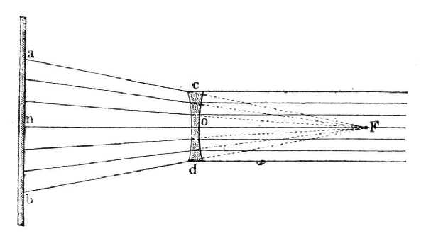 ennek széléhez közel esik és mindegyik körben a fény számára 34 lyukat készítünk és ezután a papirost a lencsére reáragasztjuk: akkor látni fogjuk, hogy midőn a lencsét a fényforrás, példáúl a Nap elé tartjuk, a nagyobb körön átmenő sugarak a lencséhez közelebb, a kis körön átmentek attól távolabb találkoznak. E szerint a valamely pontról fénytörő felületre eső sugarak, törés után nem esnek egy pontban össze, hanem mennél távolabb az optikai tengelytől érik a fénytörő felületet, annál közelebb a lencséhez van a találkozásuk pontja. Ezt nevezik szférikus vagy gömbi eltérésnek.