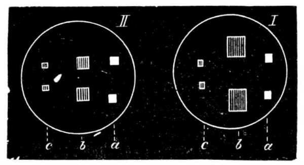 Midőn a megvizsgált szem távolra néz az 51. ábrán t-n túl, a tükörképek az 52. ábrán I., midőn a közel pontra, az 51. ábrán t-re van alkalmazva, ugyanazon ábrán II. alatt feltüntetett módon tűnnek elő. A tükörképek közül az a-val jelöltek a porczhártya, a b-vel jelzettek a lencse mellső és a c-vel jelöltek a lencse hátsó felületének felelnek meg. A szem közelre való alkalmazkodásakor tehát, a porczhártya tükörképén semmi változás nem tűnik fel, ellenben igen szembeötlő a lencse mellső felülete tükörképeinek változása: