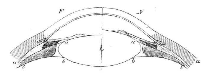 A szemből kivett lencse mindig vastagabb, mint a szemben levő. A kivett lencse alakja az erősen közelre alkalmazkodó lencse alakjának felel meg s így következik, hogy a szemben valami erő az üvegtesthez odalapítja a lencsét és hogy közelnézéskor ez a nyomás kisebb-nagyobb fokban megszunik és a lencse rugalmasságánál fogva nyeri vissza domborúbb alakját. Vajjon mi szorítja a lencsét az üveg-testhez, csak úgy lehet megtudni, ha a lencse helyzetét a szemben figyelembe veszszük.