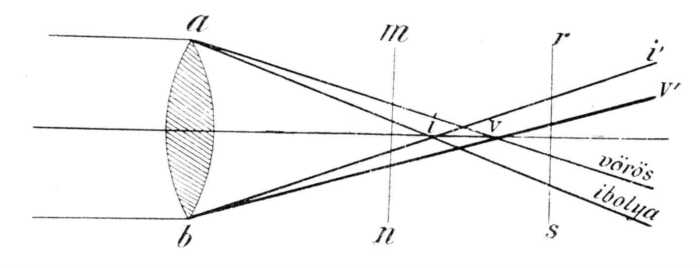 Ismeretes dolog, hogy midőn színházi látócsövön vagy rossz távcsövön keresztül nézünk, a látott tárgyaknak színes szélök van. A napfény, valamint a többi világító tárgyaink, tudvalevőleg különböző törésű sugarakat árasztanak szét. A különböző törésű sugarakat felismerjük az érzésben, mivel különféle színérzést okoznak. Midőn vegyes fénysugár hatol keresztül a lencsén, az ezt összetevő különböző törésű sugaraknak más-más helyen van a főgyújtópontja. Ebből következik. hogy az egy pontból eredő különböző törésű sugarak nem adhatják törés után a világító pontnak egyetlen éles képét. Midőn az egyik nemű sugarak a lencse mögött egy bizonyos távolságban egyesülnek, a többiek ugyanazon távolban nem találkozhatnak, hanem, törésük foka szerint, előbb vagy később egyesülnek. A törékenyebb sugarak főgyújtópontja közelebb van a lencséhez, a kevésbbé törékenyeké pedig távolabb attól. Az ibolya s a kék suga-