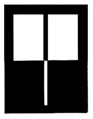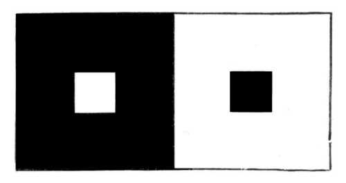 Az 57. ábrán két egyenlő nagy négyszögbe két kisebb, szintén egyenlő nagy négyszög van berajzolva. Ha az ábrát kissé nagyobb távolságból nézzük, a két kisebb, egyenlő nagy négyszög közűl a világos sötét alapon nagyobbnak tetszik, mint a fekete fehér alapon. Igen szép idevágó kisérlet a következő is: 20 cm magas, 15 cm széles kemény papiros felső felét fehér papirossal vonjuk be, alsó felét pedig feketére festjük. Azután 4 mm széles fekete csíkkal a felső fehér felét és épen úgy ugyanolyan széles fehér csíkkal az alsó fekete felét, két egyenlő részre osztjuk fel, ]gy, a mint az 58. ábrán látható. Ha most a lapot úgy akasztjuk a szoba falára, hogy jól meg legyen világítva és 45 méternyire eltávozunk tőle, akkor a fehér csík feltünően szélesebbnek tetszik majd, mint a fekete.