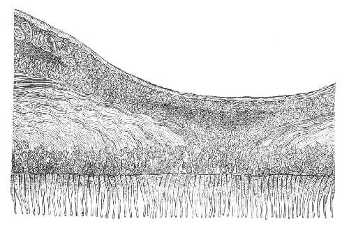 (SCHULTZE szerint).erős nagyítással, kívülről az érhártya felül befelé, a 18-ik ábrán feltüntetett következő részeket fel lehet rajta ismerni.