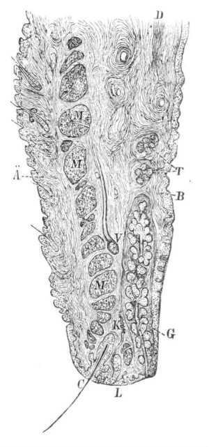 41. ábra. Ember felső szemhéjának keresztmetszete. B kötőhártya, C szempillaszőr, G Meibom-féle mirigy, L szemhéj alsó széle, M a szem záró izmának keresztmetszete.