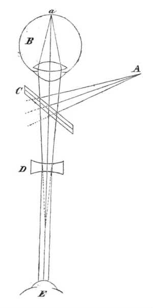HELMHOLTZ a tökéletesebb visszaverődés kedvéért egy üveglap helyett hármat vett. Az A-tól, mint világító ponttól jövő sugarak természetesen széthajlóan esnek a B szembe és ha e szem az A tárgy távolságára alkalmazva van, a-ban a fényforrás éles képe fog lenni. B szemből (a fénysugarak ismét annyira összehajlóan jutnak ki, mint a mennyire széthajlóan estek a szembe. A szemből visszaverődő sugarak ugyanazt az irányt követik, melyben a szembe beestek; tárgy és képpont kapcsolatos gyújtópontok. Az üveglapokon a sugarak egy része A felé vissza is verődik s ez a fény a nézőre nézve elveszett; azonban a fénynek egy másik része a C üveglapokon keresztül megy és az A fényforrás távolságának megfelelőleg egy képpontban egyesül. Útközben e sugarak azonban D szóró lencsére találnak, mely az összehajlóan haladó sugarakat annyira széttéríti, hogy ezentúl párhúzamosan mennek E vizsgáló szem felé. Ha E szem rendesen látó, úgy a bejutó sugarak segedelmével B szem megvilágított hátterén a fényforrás éles képét látja.