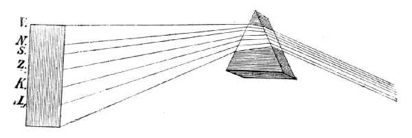 Midőn sötét szobában keskeny résen át fényt bocsátunk a hasábra (64. ábra), akkor mindenekelőtt feltünik az a nagyfokú eltérés az eredeti iránytól, mely a fényt éri. Ha pedig az eltérített sugarakat ernyőn felfogjuk, a résnek nem fehér, hanem tiszta, szép színek egész hosszú sorából álló képét