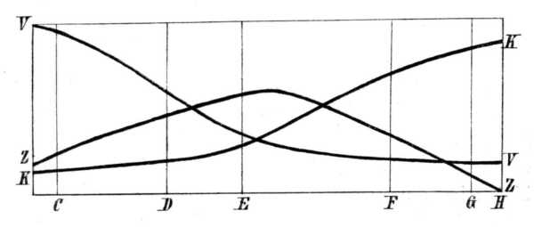 A metszéki vonalon [abszcisszán] följegyzett FRAUENHOFER-féle vonalak jelölik a színkép illető helyét, a rendezői magasságok [ordináták] az izgalom azon viszonylagos fokát, melyet az illető fény a három végkészülékben támaszt. A V V görbe a vörös, a Z Z