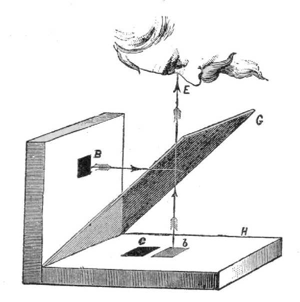 dalát fehér papirossal vonjuk be és a két deszka közé 45° szög alatt színes üveget teszünk. Ennek következtében az E-nél levő szembe kétféle fény esik, a mennyiben az üveglap B oldal fehér fényét a szem felé reflektálja s ez többé-kevésbbé fehér fényérzést okoz. A H lap fénye a színes üvegen megy keresztűl és e miatt mint színes fény kerül az E szembe. Feltéve, hogy az üveglap vörös színű, a H-tól jövő fény is vörös. A fehér és vörös fény együttes hatása halványvörösnek tetszik. Ha azután B-hez kis fekete négyszöget erősítünk oda, akkor ennek képét, a fény visszaverődése miatt, b-nél látjuk. Ez a kép, az üveglapon át H-tól a szembe eső vörös fény miatt nem feketének, hanem sötét vörösnek tetszik. Ha ezután hasonló fekete négyszöget c-nél a H lapra is ragasztunk, ezen négyszögtől az üveglapon keresztűl a néző szemébe semmi vagy legalább igen kevés fény jut, minél fogva feketének, vagy legfeljebb szürkének kellene látnunk; tényleg pedig zöldes-kéknek véljük. Ez onnan van, mert a H lap többi részeitől, mint alapszín, vörös fény jut szemünkbe, e miatt a halvány fehéret a kiegészítő színben, kékes-zöldben véljük látni.