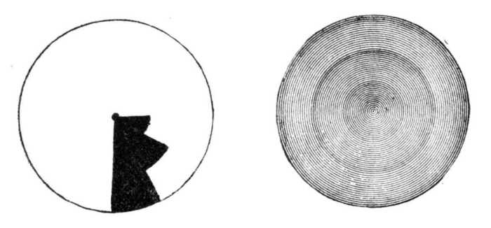 szerint be van feketítve. Ilyenkor a korong közepe felá mind sötétebb szürke gyűrük keletkeznek. Várható volna, hogy mindegyik gyűrü színe egyenlően szürke legyen, valóban pedig a dolog nem így van: mindegyik gyűrű a korong közepe felé világosabban árnyékoltnak tetszik. Ott, a hol valamely gyűrü nálánál világosabb gyűrűvel érintkezik, az ellentétesség miatt sötétebbnek és megfordítva ott, hol sötétebb gyűrüvel érintkezik, világosabbnak tetszik.