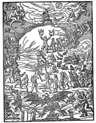 JOHANNES TEUTONICUS, halberstadti lelkészről, korának egyik leghirhedtebb varázslójáról beszélik, hogy az 1221-ik évben egy éjszakán egyidejűleg 3 helyen mondott misét, egyet Halberstadtban, egyet Mainzban, s a harmadikat Kölnben. A boszorkányok kenőcscsel szokták magukat bekenni, mely újszülött gyermekek zsírjából és különféle füvekből, úgymint mákból, csucsorból, napraforgóból, bürökből és beléndekből készül, mire azután módjukban van, hogy a levegőn átnyargaljanak, még pedig mindenféle szerszámok: kefék, csipővasak és vasvillák segítségével. Ezeket a közlekedési eszközöket leginkább a nagy évforduló ünnepen, a boszorkányszombaton használják, melyet rendszerint magas hegyen, némely országokban nagy erdőkben, szabad térségen szoktak megülni. A dán és német boszorkányok tudvalevőleg a Blocksberg nevű hegyre (a dánok néha a Hekkenfeldtre, a Heklára Izlandban) vonulnak, a svédek az oelandi Blaakullá-t, a norvégok Lyderhorn-ot (Bergen közelében) részesíitik előnyben és így minden ország boszorkányainak meg van a maguk külön helye. Az ünnepet Valburga éjjelén, május 1-én vagy Jánosnap éjszakáján szokták megülni. Ezeken az ünnepségeken az összes boszorkányoknak részt kell venniök; az olyat, a ki