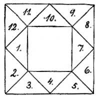 Ha a csillagokat már most ez vagy amaz iránt meg akarjuk kérdezni, előbb az égnek az illető pillanatban látható képét kell tökéletesen fölrajzolnunk. E czélra a 8-ik ábrában jelzett minta szolgál. A 12 számozott térség a 12 házat jelenti és minden házba berajzoljuk az égi jegyet és a bolygókat, melyek az illető pillanatban ott vannak. A bolygóknak az egyes házakban és jegyekben való állásából most már minden képzelhető jövendő eseményre következtetni lehet.