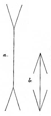 A mellékelt (38.) ábra p. o. két egyenes vonalat ábrázol; a ugyanolyan nagy, mint b. Ezt azonban lehetetlen megismerni, még pedig ama szögek miatt, melyeket a szárak az a és b egyenesekkel állandóan alkotnak. Ugyanígy áll a dolog a 39. és 40. ábrában bemutatott négyszögekre nézve; mindkét alak szabályos négyzet, csakhogy a vonások fekvése és iránya szerint az egyik magasabbnak, a másik szélesebbnek látszik. Ilyen csalódás sokféle van; bizonyítják, mily könnyen lehet ítéletünket megtéveszteni. Hát még milyen óriási