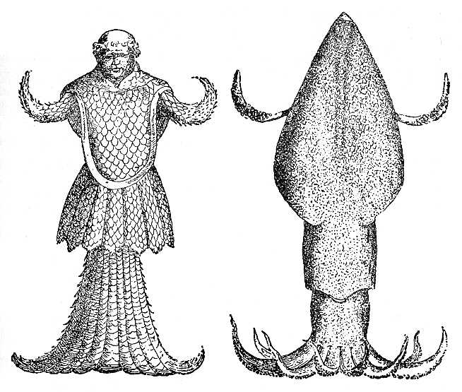 négy rőf hosszú lehetett, elküldték a királynak, ki megszárítva, mint valami csodát őrizteti. A halászok állítólag héringekkel együtt fogták a hálóban. ALBERTUS szerint e fajta halat a britanniai-tengerben is fogtak." J. STEENSTRUP dán tanár a tengeri barát különböző leírásának és e szörnyeteg képeinek összehasonlításából arra az eredményre jutott, hogy a tengeri barát azonos a tízkarú tintahallal. Ez utóbbi szine fekete, vörös foltokkal, a bőr szemölcseit és a karok szívókáit fölületes megtekintésre könnyen pikkelyeknek nézhetjük. Ha az ilyen állatot partra vetve képzeljük, a mint a hasán fekszik, és hosszú karjai alája kerülnek, találhatunk rajta valamit, a mi egy halfarokban végződő barát formájára emlékeztet. A szemléltetés kedveért mellékeljük STEENSTRUP-nak a tintahalat ábrázoló rajzát, és a tengeri barát egyik régi képét, a mint RONDELET-nél és GESNER-nél találjuk. (41. ábra.)
