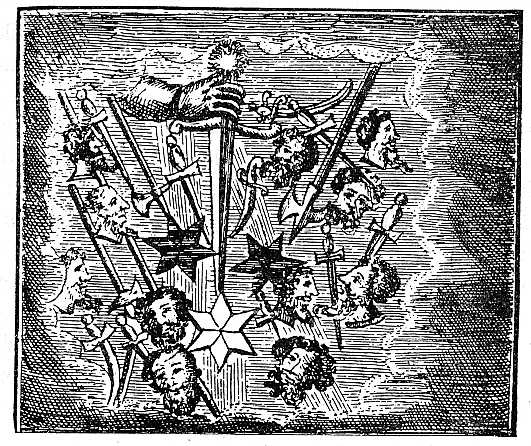 verekhez, kardokhoz és tőrökhöz hasonlítottak, melyek között sok szakállas, hajzatos emberfej jelent meg. Mindez össze-vissza hányva véres színű és izzó volt, a mitől sokan megijedtek és megbetegedtek. Erre azután nagy nyomorúság lett; betört a török, Rómát pedig Bourbon [!] ostromolta; a pápa az angyalvárban is csak nagynehezen tartotta magát, de 40,000 arany árán kiszabadult, mire a császár ismét visszahelyezte".
