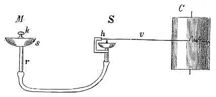 A készüléknek három része van: az M felfogó, az S írókészülék és a C henger, mely utóbbira az írás kerül. Az M felfogó kis fémtányérka (s), mely alul az r csőben végződik, s a melyre felül vékony kaucsukhártya van feszítve. E hártyára könnyű fából készült kis gomb van enyvezve (k). Az írókészülék berendezése a felfogóhoz hasonló. Ezt is alul kis csőbe végződő fémtányérka alkotja, melyre ugyancsak kaucsukhártya van kifeszítve. A csőre kis fémnyereg van erősítve, melynek legmagasabb (h) pontja körül a nagyon hosszú, vékony, hajlékony és finom