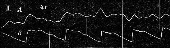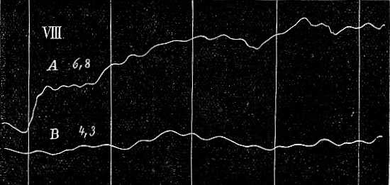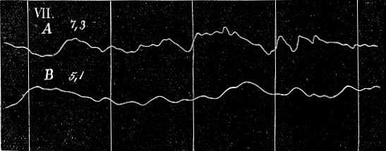 De hát honnan erednek a kis rezdülések? Némelyiket határozottan a szívműködés idézi elő. Valahányszor a szív összehúzódik, és a vért a testbe szorítja, a szervezet minden pontja belülről, vagyis a véredényrendszerből kiinduló gyenge lökést kap. A feltételek előnyös alakulása esetén azt is könnyen bebizonyíthatjuk, hogy a kar bizonyos rezdülései az érveréssel pontosan találkoznak. Ha a 47-ik ábrán a rezgő mozgás A görbéjét, az avval egyidejűleg felvett, s az érverést ábrázoló B görbével összehasonlítjuk, feltünik, hogy a kettő nagyon hasonlít egymáshoz; még az érverés görbéjének lehágó szárán látható kis emelkedések is meglátszanak a rezgő mozgás görbéjén. Az A görbét az a körülmény jellemzi, hogy ebéd után egy óra mulva vettük fel s mely órát pihenéssel és csevegéssel töltöttem. Ez alatt a test teljesen kipihent és bizonyosan ennek köszönhető, hogy az érverés olyan tisztán észrevehető. Mert ha izmaink és idegeink kimerültek, akkor agyunk az izmok együttes működését pontosan nem szabályozhatja; így azután az ebből eredő mozgások erősebben hatnak, és az érverés képét eltörlik. Hogy ez