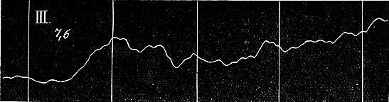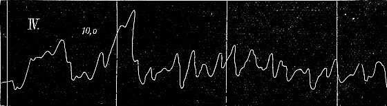 Ezen a pulzusnak nyomát sem láthatjuk; a mozgások nagyobbak, a görbe zeg-zugosabb. A görbék fölött látható kis számok hosszabb időtartamok egy-egy másodperczére eső rezgéseinek középszámát jelzik; látjuk, hogy a 48. ábrán a nyugtalanság sokkal nagyobb volt, mint a 47. A. ábrán. Még nagyobb a rezgési szám a 49. ábra görbéjén, melyet akkor vettem fel, midőn a kar vízszintes helyzetben perczeken át ki volt nyujtva, a mi tudvalevőleg nagyon megerőltető és a kart könnyen rezgésbe hozza. Ebből következik tehát, hogy valamely testrész annál élénkebben reszket, minél fáradtabbak az izmok és az idegek.